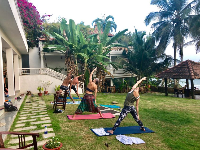 Our yoga retreat in Kerala combines the relaxation, enjoyment and space of a beach holiday with time everyday devoted to caring for your body & mind through morning practice of meditation and two different yoga classes every day with Raj – morning and evening. You are nourished by delicious, fresh, healthy food. Your spirit is enriched by the beautiful landscape… trees everywhere, lush gardens, gorgeous sandy beaches and sea for miles. You make new friends.